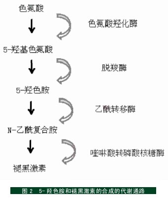 除蛋白質合成以外,色氨酸同時還參與許多復雜的代謝通路。一旦被小腸吸收,色氨酸將進入門靜脈,經過肝臟,一部分用于蛋白合成,剩下的主要參與以下兩個主要的代謝通路:首先小部分色氨酸主要在腸道、血小板和腦中用于合成神經傳遞素5-羥色胺;第二條代謝通路是犬尿氨酸通路,主要是合成3-羥基犬尿氨酸、3-羥基氨基苯甲酸、喹啉酸、犬尿喹啉酸和煙酸(Brown,1995)。哺乳動物血漿中的色氨酸90%是與白蛋白結合在一起的,其余以游離的形式存在,經血腦屏障進入大腦(BBB;Madras,etal.,1974),并在松果體細胞中的色氨酸羥化酶作用下轉變成5-羥基色氨酸,并最終經過脫羧轉變成5-羥色胺(圖2)。作為神經傳遞素,5-羥色胺參與調節大量的行為過程,如食欲、采食、沖動、侵略、性行為、溫度調節、疼痛感知和情緒控制。作為一個神經激素,褪黑激素在控制動物晝夜節律中發揮作用,并作為細胞內清道夫,清除羥基和超氧自由基(Reiteretal.,1994)。