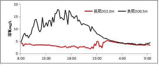 使用了葉輪增氧機和涌浪機之后,上下層水體得到了混合,底層溶氧得到大幅提升,如下圖: