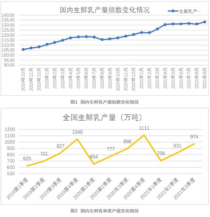 據(jù)國(guó)家統(tǒng)計(jì)局?jǐn)?shù)據(jù)顯示,2021年第三季度,全國(guó)牛奶產(chǎn)量974萬(wàn)噸,比去年同期增加76萬(wàn)噸,增長(zhǎng)8.5% 。