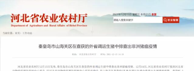 河北省農(nóng)業(yè)農(nóng)村廳網(wǎng)站12月15日消息,秦皇島市山海關(guān)區(qū)在查獲的外省調(diào)運(yùn)生豬中排查出非洲豬瘟疫情。12月14日,河北省農(nóng)業(yè)農(nóng)村廳接到河北省動(dòng)物疫病預(yù)防控制中心報(bào)告,經(jīng)河北省動(dòng)物疫病預(yù)防控制中心實(shí)驗(yàn)室確診,在山海關(guān)區(qū)查獲的2車(chē)外省調(diào)運(yùn)生豬中排查出非洲豬瘟疫情。查獲時(shí),2車(chē)共有生豬245頭,死亡9頭。