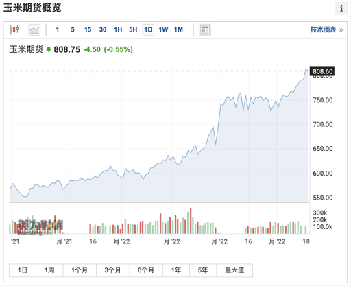受此影響,糧食大宗商品價格再度大漲。美國時間周一,美國CBOT 7月玉米期貨大漲2.8%,突破每蒲式耳8美元,創2012年9月以來的近十年新高,較年初的6美元上漲1/3。