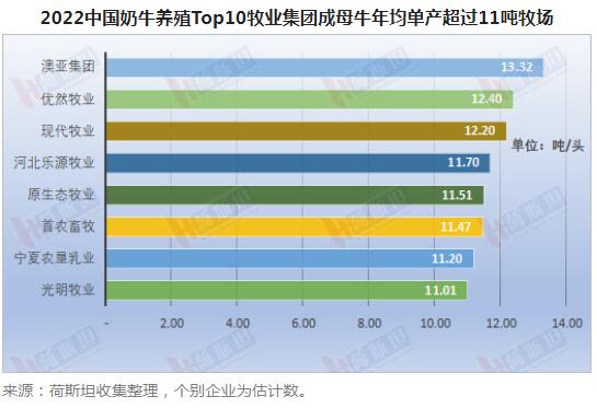 TOP10牧業集團中,有8個牧場單產超過11噸,其中12噸至13噸的2個牧業集團(優然牧業和現代牧業),超過13噸的牧業集團僅澳亞集團。