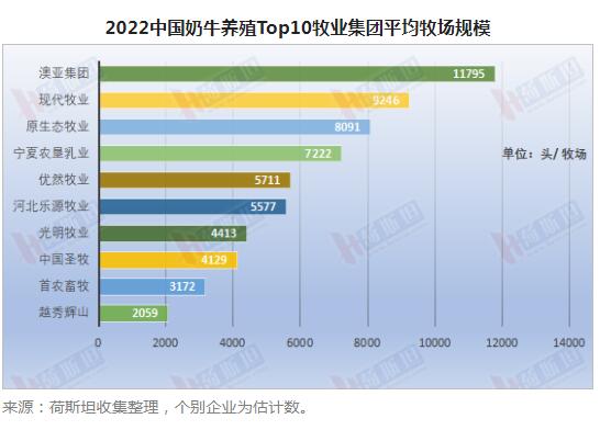 平均規模超過5400頭,比2021年提高11%,大型牧場是集團牧場的主流 澳亞集團牧場平均存欄11795頭,位居第一,平均規模都超過8000頭的集團有:現代牧業為9246頭,原生態牧業為8091頭,分居第二、第三。