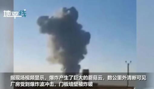 據現場視頻顯示,爆炸產生了巨大的蘑菇云,數公里外清晰可見。廠房受到爆炸波沖擊,門板墻壁被炸破。