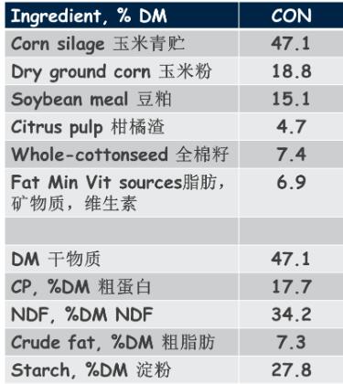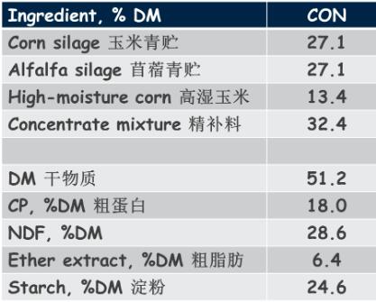 試驗選用114頭多胎荷斯坦奶牛,這些牛進入試驗時是在泌乳第41天,所以是多批次納入。同時,試驗牛要接受Calan飼喂系統的使用訓練。Calan飼喂系統預先給每頭牛制定了獨立飼喂門,每頭牛可以獲得飼喂門里的飼料。牛在第一周要接受相關訓練,適應飼喂門,然后是兩周的調整控制變量和13周的干預時間,這兩周的時間給奶牛飼喂同樣的基礎日糧,不進行任何干預,然后分析所有動物的基礎指標,了解奶牛的生產性能,同時基于這些指標進行分析。為什么這兩周很重要?因為試驗可能分2-3組,一組在研究開始前指標就比另一組好,在研究結束時還是比其他組好,這樣不能確定指標高是因為動物本身的因素還是牛經過了干預之后性能更好了?所以調整控制變量的兩周特別重要。