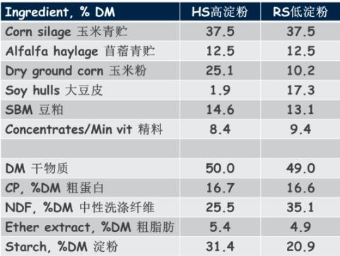 第一組使用高淀粉的日糧(HS0),第二組是高淀粉日糧+每天每頭牛兩克活酵母(HS2),第三組是高淀粉日糧+4克活酵母(HS4),這些高淀粉日糧都不含碳酸氫鈉。對照組使用低淀粉日糧,增加了碳酸氫鈉,確保奶牛的瘤胃健康,不會產生降解的效果,這樣可以進行很好的對照試驗。