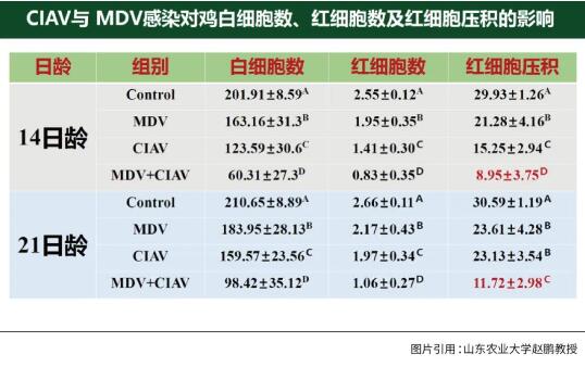 ①對細胞壓積的影響:通過實驗數據我們看到,正常雞紅細胞壓積HCT值為29,符合國際普遍27以上的正常標準,傳貧單獨感染組HCT值是15,但是當傳貧和馬立克兩個共染之后雞的紅細胞壓積是8.9,只有正常雞1/4 左右的水平。我們都知道,紅細胞不僅能運輸氧還有很強的免疫功能,紅細胞壓積這么低,雞的免疫機能也會受影響。雖然雞到了21日齡有所緩和,但這兩種病毒共感染相對于傳貧單感染或者雞馬立克單感染以及正常的雞依然有很大差別。雖然28日齡、35日齡時有所恢復,但仍無法恢復到正常雞的水平,這就是共感染對紅細胞壓積也就是貧血的不良影響。