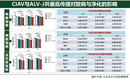 ④傳貧和白血病通過雞胚共同垂直傳播后對下一代的影響。實驗研究發現前兩周對整個免疫器官會產生損傷,毫無疑問共感染對脾臟、法氏囊都有一定影響。另外,這兩個病毒通過雞胚垂直傳播之后,也會幫助另一個病毒在機體內顯著增強復制。