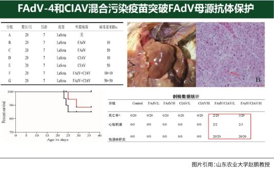 2016 年我國出現安卡拉病后,我戲稱傳貧和腺病毒是咖啡和伴侶,它們離了誰都不香。比如,我們率先從某新城疫活疫苗中檢出傳貧和腺病毒的混合污染,花了很大的力氣把這兩個病毒純化出來,進行重復模擬實驗。最后我們發現,單獨污染腺病毒的疫苗使用后并沒有像臨床上80%那樣的死亡率,但同樣的腺病毒和同樣的劑量,加上傳貧混合污染后的疫苗再使用,就出現了高達75%的死亡率,非常切合當時臨床實際情況。