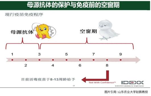 我們通常通過免疫或自然感染誘導后,再監測種源的傳貧抗體滴度、整齊度、離散度,以及監測下一代雛雞的母源抗體滴度、整齊度、離散度。我們希望抗體滴度越高越好,離散度越低越好。無論用什么方式實現了這個目標,臨床上一般不會出現傳貧的問題。所以傳貧防控的核心一直是讓雞獲得足夠的高質量的母源抗體,以此擋住傳貧的早期感染,如果能擋住早期感染,即使大日齡的雞再感染也會很容易產生傳貧抗體,不容易形成持續性帶毒或者垂直傳播,從而又容易產生新的抗體,形成新一輪的抗體循環。我們希望母源抗體能在傳貧最易感的時期保護雞群免于感染,以避免長期持續帶毒及形成垂直傳播的可能性。對于傳貧,無論是疫苗免疫還是自然感染誘導,我們希望抗體升上去后在整個產蛋期保持非常平穩的狀態。