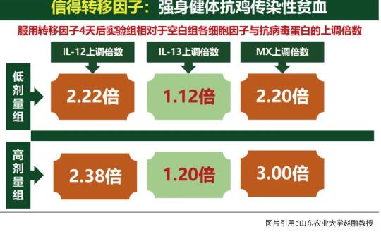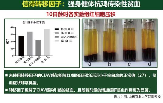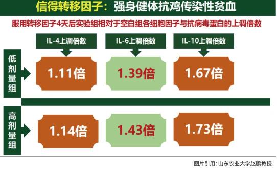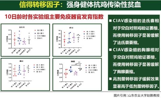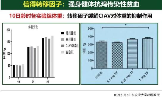 拋開抑制病毒感染而言,信得轉移因子對生長性能也有促進作用。實驗中我們發現,使用了高劑量信得轉移因子的實驗組雞群,即便有傳貧感染體重仍然能夠接近正常SPF雞的水平。