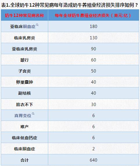 來自丹麥、加拿大、瑞士和英國全球頂級(jí)奶牛經(jīng)濟(jì)學(xué)家經(jīng)數(shù)年戮力合作、即將發(fā)表專門就全球飼養(yǎng)奶牛的所有183個(gè)國家和地區(qū),奶牛12種常見病分別給各國和全球奶牛養(yǎng)殖業(yè)造成經(jīng)濟(jì)損失的研究報(bào)告,參閱表1。這些經(jīng)濟(jì)損失包括奶產(chǎn)量+繁育力+淘汰率,但不含治療費(fèi)用。奶產(chǎn)量減少導(dǎo)致的經(jīng)濟(jì)損失按原奶標(biāo)準(zhǔn)價(jià)格估算;繁育力經(jīng)濟(jì)損失按額外增加的產(chǎn)犢間隔天數(shù),乘以每日奶產(chǎn)量,再乘以標(biāo)準(zhǔn)奶價(jià)來確定;淘汰成本則是根據(jù)增加提前淘汰風(fēng)險(xiǎn)進(jìn)行估算:投產(chǎn)健康頭胎牛價(jià)格-提前淘汰牛售價(jià),再乘以增加的風(fēng)險(xiǎn)率。不考慮治療費(fèi)用原因是:許多情況下,奶牛可能同時(shí)患有這12種常見病其中的數(shù)種,這無疑將導(dǎo)致總疾病成本出現(xiàn)重復(fù)計(jì)算誤差。研究人員曾根據(jù)這12種常見病之間的統(tǒng)計(jì)關(guān)聯(lián)對(duì)數(shù)據(jù)進(jìn)行了調(diào)整;如果不剔除治療費(fèi)用,全球奶牛養(yǎng)殖業(yè)因這12種常見病造成的平均總損失則會(huì)被高估45%。