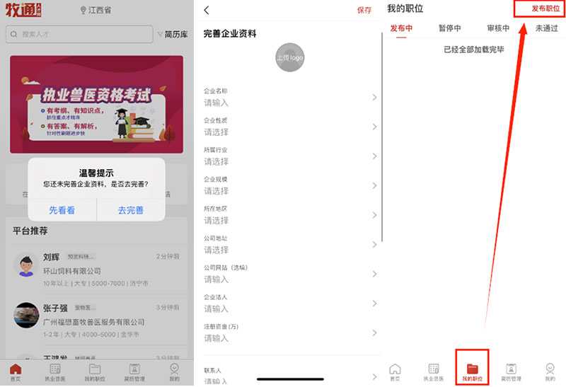 2、登錄app后,去完善【企業(yè)資料】,按照提示詳細(xì)填寫,讓求職者更好地了解企業(yè)概況。然后進(jìn)行【企業(yè)認(rèn)證】,完成后點(diǎn)擊app底部狀態(tài)欄的“我的職位”——右上角“發(fā)布職位”,按照提示填寫完成點(diǎn)擊“發(fā)布”。(注:若未辦理會(huì)員招聘信息不被展示在app上。)