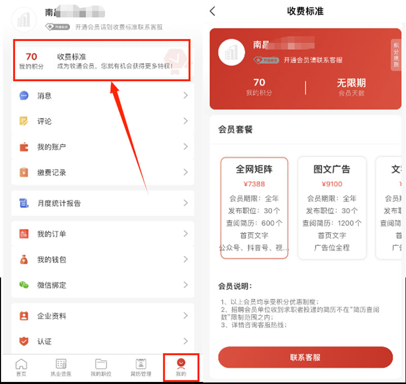 3、未開通會(huì)員,招聘信息將一直停留在“審核中”或“未通過”狀態(tài)。可在app底部點(diǎn)擊“我的”來(lái)到個(gè)人中心頁(yè)面,點(diǎn)擊“收費(fèi)標(biāo)準(zhǔn)”,可看到會(huì)員套餐,左右滑動(dòng)可選擇開通符合企業(yè)招聘需求的套餐。也可聯(lián)系客服,讓客服為您提供周到的講解服務(wù)。