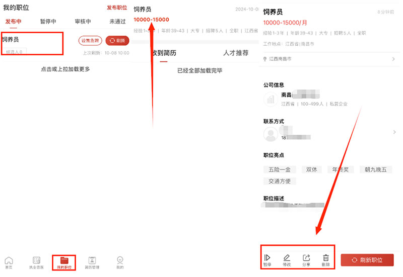 4、開通會(huì)員后,企業(yè)招聘信息成功展示,可設(shè)置“急聘”或刷新崗位(表示正在招聘中...)。如需暫停/修改/刪除正在“發(fā)布中”的某一職位信息,找到該崗位并點(diǎn)擊—崗位跳轉(zhuǎn)到獨(dú)立頁(yè)面后再次點(diǎn)擊,頁(yè)面下方有暫停/修改/刪除按鈕(如圖3),點(diǎn)擊需要操作的按鈕即可。