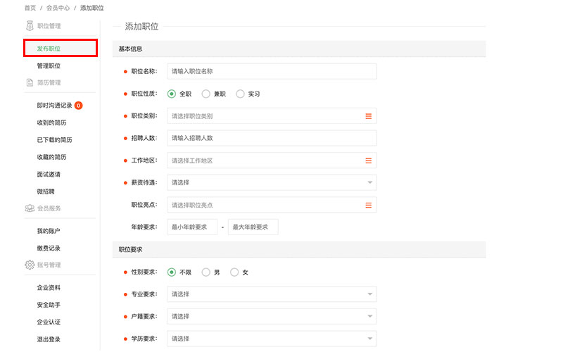 3、點(diǎn)擊左側(cè)的“發(fā)布職位”,填寫好相應(yīng)的崗位要求后,點(diǎn)擊“確認(rèn)提交”按鈕即可發(fā)布。注:若未辦理會(huì)員招聘、信息不被展示在網(wǎng)站上。(小貼士:有“*”標(biāo)注的項(xiàng)目為必填項(xiàng)。)