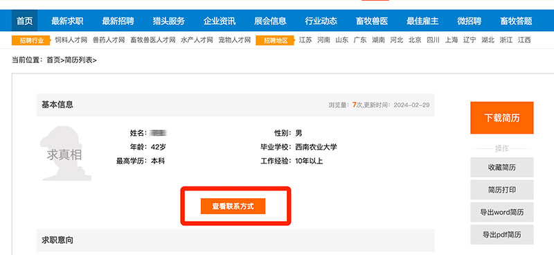 6、已辦理正式會(huì)員的企業(yè)用戶在登陸后,有權(quán)限下載查看畜牧人才的具體聯(lián)系方式。步驟為:首頁(yè)—簡(jiǎn)歷列表,選中某一個(gè)求職者簡(jiǎn)歷,點(diǎn)擊“查看聯(lián)系方式”按鈕即可。